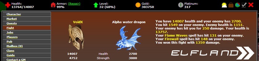 ![]() ElflandElfland was closed in 2025. Source code is available on request.Elfland is an online role-playing game in a fantasy world with lots of adventure. Follow the storyline, prepare for battles with various creatures and players, do lots of quests, go to work, join a clan, and be the best! Experience, level, and goldThe game's contents are seperated into levels. Your character's level is depending on its earned experience (EXP). You can earn EXP by beating monsters or completing quests. Quests, battles, and jobs also gives you gold, what you can use to buy new armor items.Armor, weapons, and shieldsYou will need equipment to fight. You have to protect yourself with armor items, such as helmet, chest, gloves, and boots. You also have to deal damage and protection against incoming attacks. The weapons and shields are made for this. Visit the market, where you can found all the items. You can unlock more items after you level up. All items have their own stats. They can increase the damage you deal, your absorbation from hits, your health, or your block chance. They get better with every level, but they have their cost.FightsYou can fight against the agressive creatures of Eternia (where the game takes place), or against the cadatus (the opposing faction). You decide what you want to fight with. You can unlock new, and more powerful creatures on every level. The give more exp and more gold, or special creatures, such as cadutus leaders, drop special items you can't find in the market. You can fight against players too.JobsYou can work, if you don't want to do anything in the following hours. The jobs can't be interrupted, you have to wait until they end. The jobs don't give you experience, but you can earn some money. The works are good if you can't do anything else for a long time.QuestsFight through the story, and free Eternia. Complete all quests, to save the planet, and earn the bigest rewards in the game. You can unlock a story quest every level, and earn big. If you don't have a story quest, just do some freelancer quests. They are about beating monsters in fights and finishing jobs.SocialYou can access social features in Elfland. You can have your own profile page with a personalized section, and you can browse other players' pages. Play well, and rule the ranking boards, be one of the best. Join into a clan, earn points for your clan by battle wins, and increase your clan's rank on the clan leaderboards.The adventure doesn't stop here, Elfland has much more other and new features, which could help you on your journey. Use spells or the weather for your advancement, or try your luck with lucky bags. | Created2nd October 2011.Updated17th July 2015.Version2.5.2 |